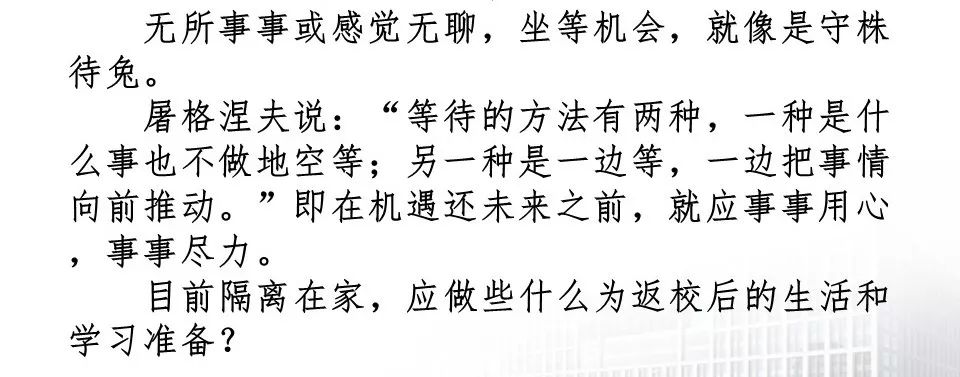 积极尝试是最好的方法。希望同学们充分利用这段时间,尝试做不同的事情,可以让自己的心安静下来。解决问题的秘笈:任何一个问题都至少有三个解决问题的办法。
